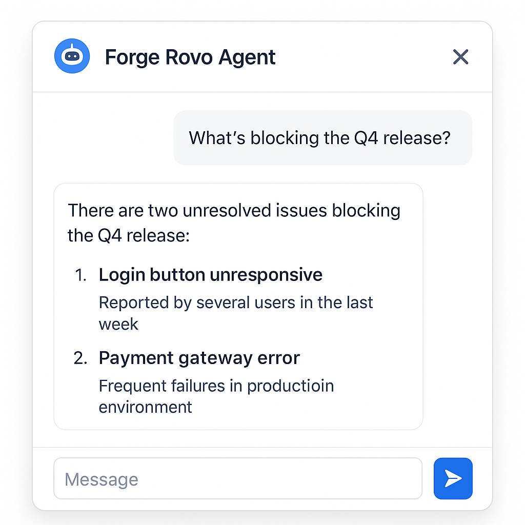 Statt dass Menschen 50 Kommentare lesen, um zu verstehen, was passiert ist, kann ein Rovo-Agent diese Informationen synthetisieren, Themen identifizieren, Trends erkennen und umsetzbare Zusammenfassungen liefern.