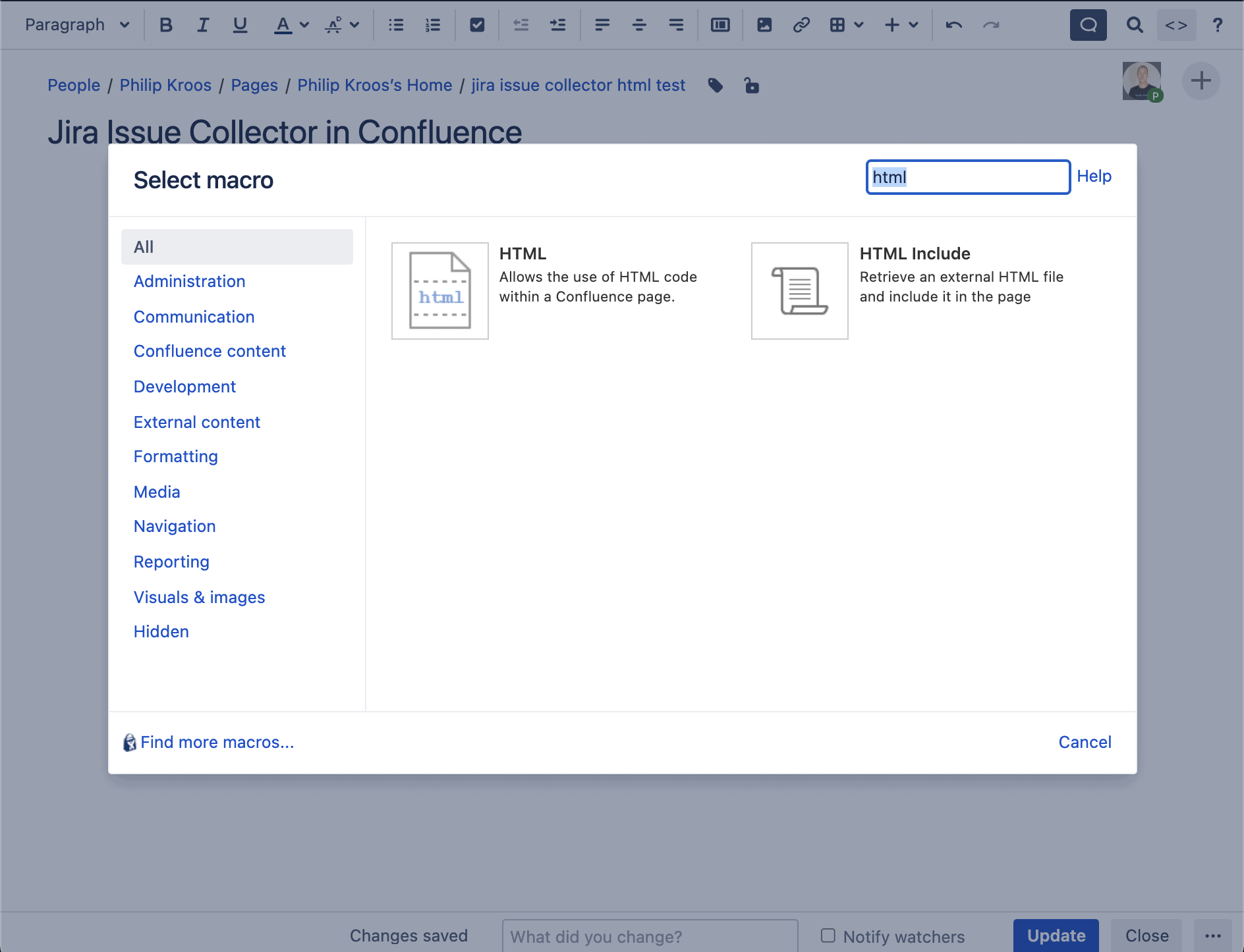 - First add the macro "HTML" by searching for HTML under "other macros".